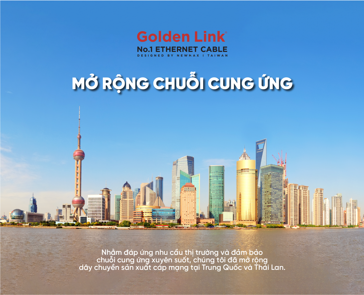 Trong hành trình phát triển, cáp mạng Golden Link được ra đời với sứ mệnh trở thành thương hiệu cáp mạng số 1 được sản xuất 100% tại Taiwan và điều đó đã được khẳng định tại thị trường Việt Nam. Tuy nhiên, trong những năm gần đây, tác động của dịch bệnh cũng như tình hình căng thẳng giữa Nga và Ukraine đã tác động rất lớn đế chuỗi cung ứng cho ngành sản xuất nói riêng và thương mại nói chung. Nhằm đáp ứng kịp thời nhu cầu cấp bách của thị trường cũng như đảm bảo chuỗi cung ứng xuyên suốt, Công ty Cổ Phần Newmax quyết định mở rộng thêm dây chuyền sản xuất cáp mạng tại Trung Quốc và duy trì song song chuỗi cung ứng tại Đài Loan. Đầu tiên là sẽ hai dòng sản phẩm mũi nhọn: